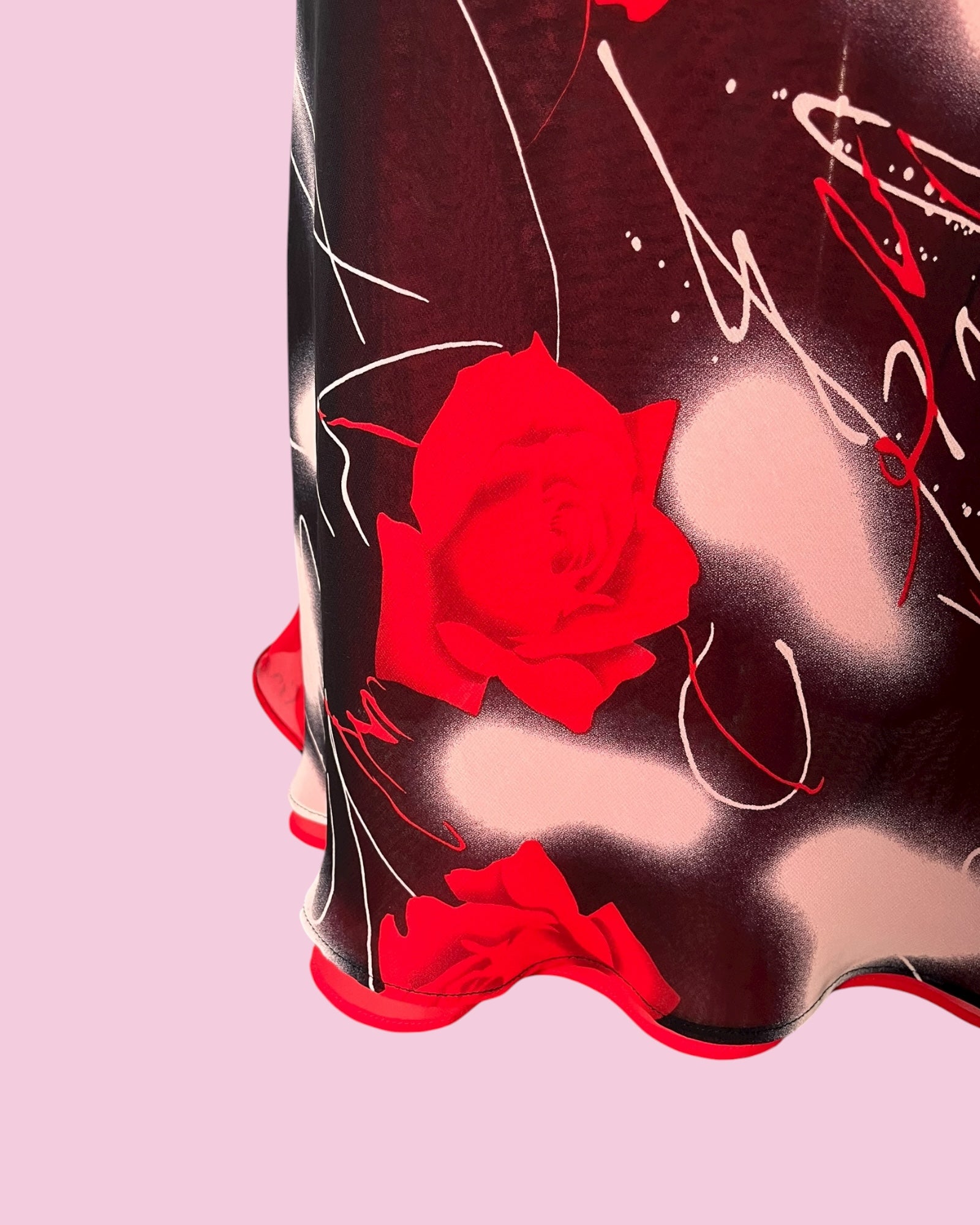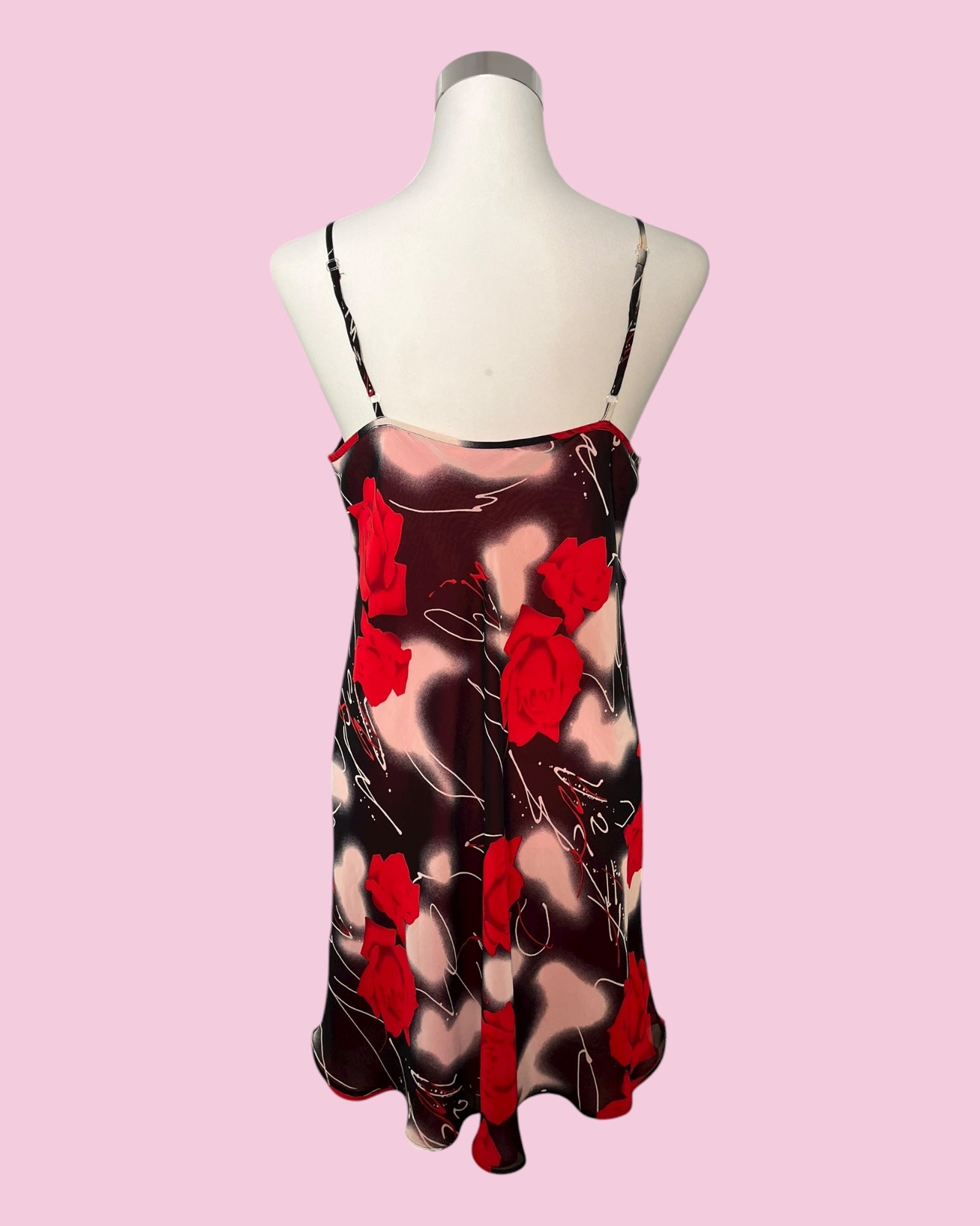 Rotes Rosenprint-Slipdress im y2k Look. Fließender Stoff, zarte Spaghettiträger und ein verspielter Wellen-Saum. Perfektes Piece zum layern.