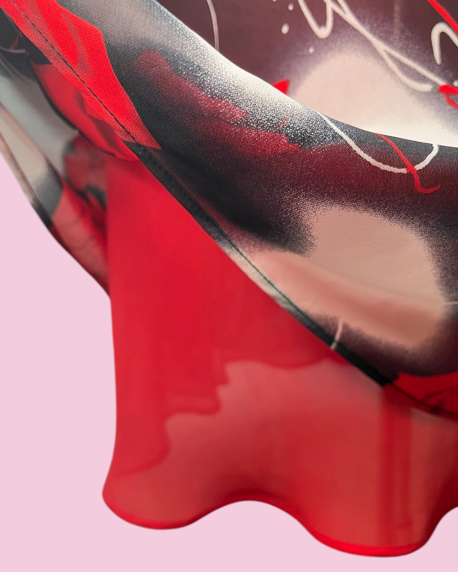 - Farbe: Schwarz-Rot mit zarten Rosa-Highlights